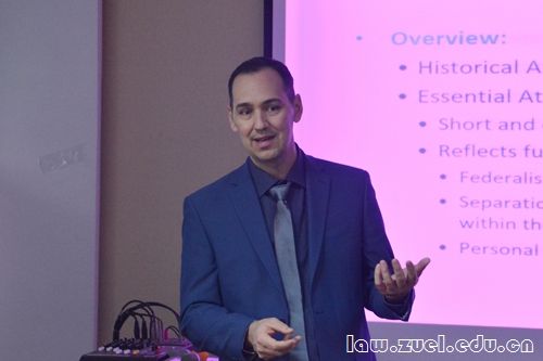 其中,Martin教授通过回顾自己的求学经历,强调了在美国学习法律掌握阅读判例法方法的重要性,只有准确找出案例中的案件事实、疑难之处、判决结果等才能高效省时地完成对判例法的学习。谈及美国宪法,教授从宪法形成的历史渊源——各州对政府的根本不信任以致让渡权利时要求权利的制约与平衡、宪法条款规定的基本原则和属性等方面作出详细论述。