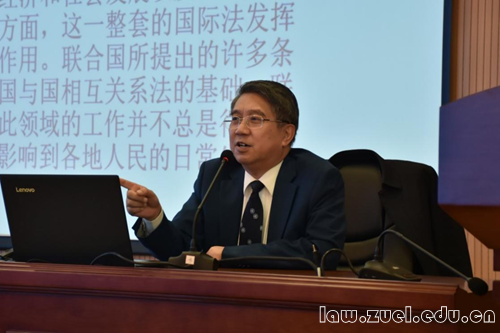 讲座伊始,黄解放老师从与中南法学的深厚渊源切入,表示中南法学的国际法学具有光荣历史和杰出传统。接着,从中国恢复联合国合法席位的艰辛历史出发,黄解放老师指出国际法在复杂的国际事务和国际斗争中发挥着重要作用。他借“铸剑为犁”铜像及其所蕴含的深刻寓意谈到联合国维护全人类发展工作面临的巨大挑战,强调德才兼备要以德为先,心有寰宇,才能肩负起维护和平、促进发展、建设人类命运共同体的历史责任。