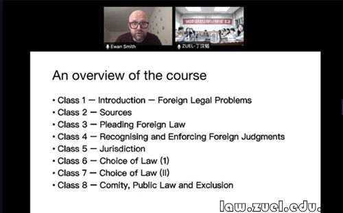 为推动法学“双一流”学科建设,我院开展“全球治理与国际组织法治青年人才培养计划”第二期,本次项目邀请来自于牛津大学的外籍教授Ewan Smith线上为我校法学专业学生开展全英文授课。本次授课采取“中教+外教”联合授课、“线上教学+线下辅导”的创新型教学模式,中方导师为我院国际法系丁汉韬老师。