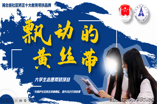 飘动的黄丝带——大学生志愿帮矫项目响应《社区矫正法》中鼓励社会力量参与社区矫正教育帮扶工作的号召,组成中南大法学、社会治理学“本硕博+教授”专业团队,以武汉市洪山区司法局为基点探索“1+2+N”大学生特色帮矫模式。项目关注社区矫正对象普遍需求,以禁毒、反诈等主题进行定向普法;聚焦个性化需求,根据其年龄、职业等开展劳动保障等主题精细化帮矫,助力社区矫正转型升级;并通过读书会等活动打开其“心墙”,打通社矫对象回归社会的“最后一公里”。